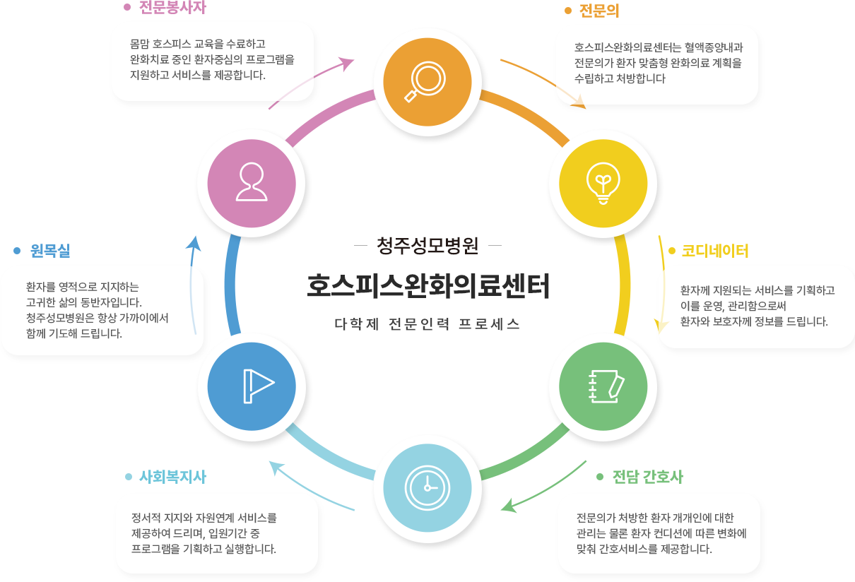 청주성모병원 호스피스완화의료센터는 다학제 전문 프로세스를 기반으로 하루하루 최선의 돌봄을 전할 것을 약속드립니다.