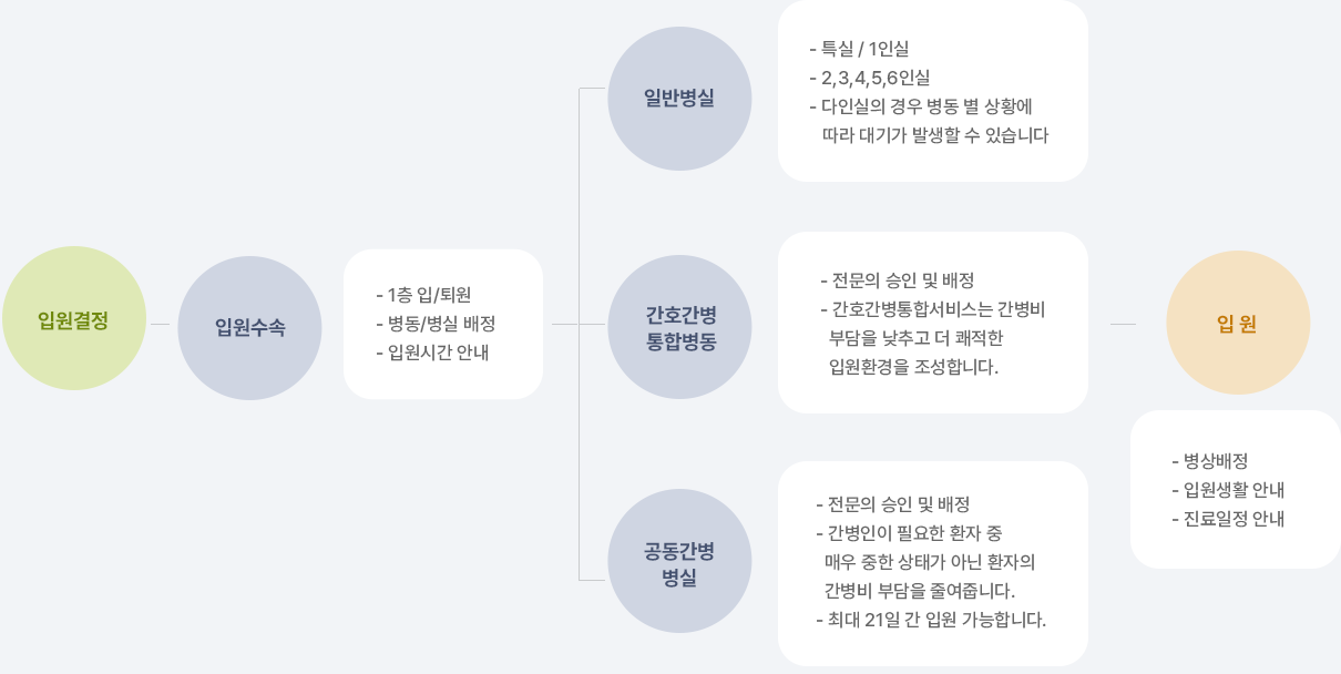 주 병동 내 병실 부족 시 타 병동으로 우선 입원 후 잔여 병상 발생 시 전실 될 수 있음